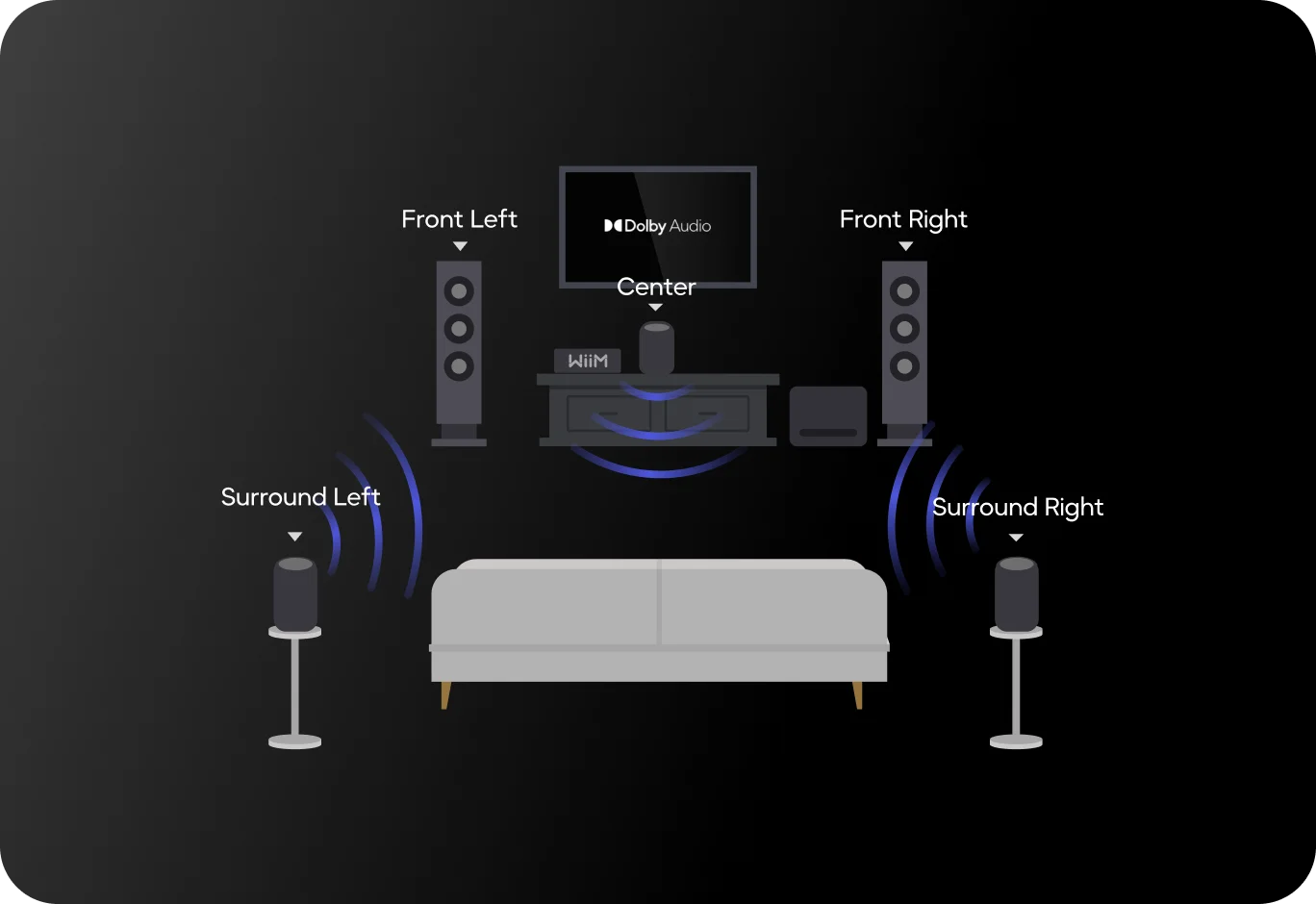 Addย WiiM Sub Proย to deepen and tighten the bass, or pair WiiM Sound withย WiiM Ultraย orย Amp Ultraย to assignย centerย orย surroundย roles in a compatible WiiM homeโtheater setup.